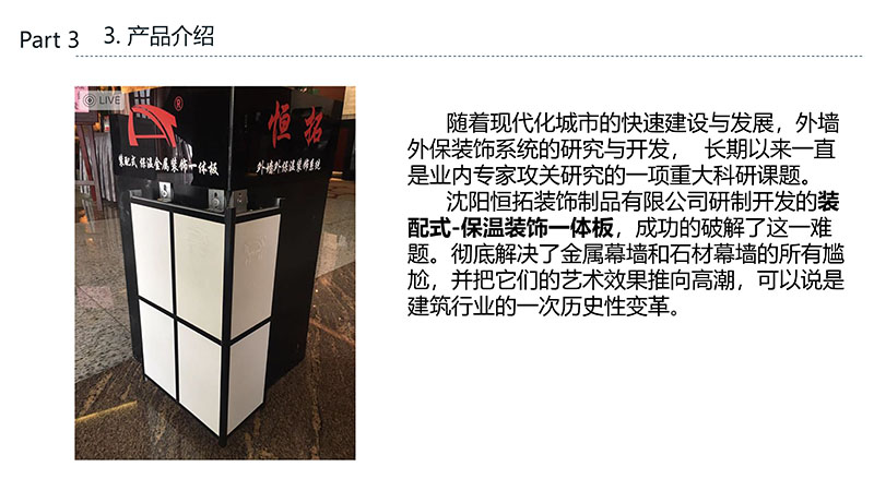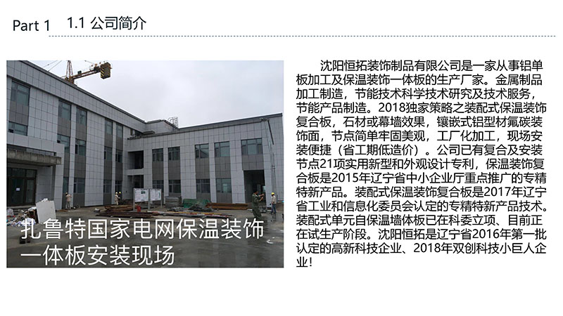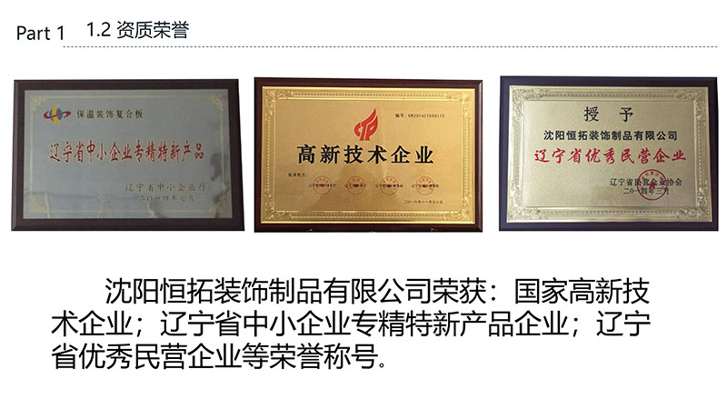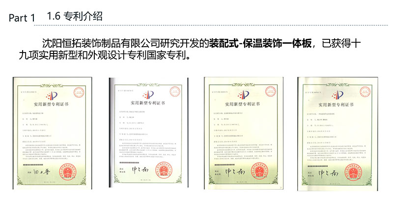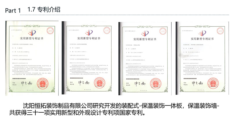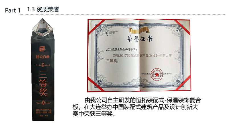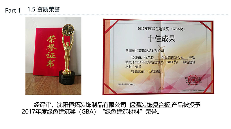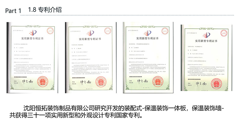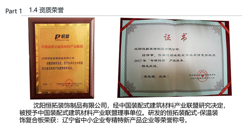 保溫裝飾一體化板的沈陽恒拓裝飾制品有限公司經(jīng)中國裝配式建筑材料產(chǎn)業(yè)聯(lián)盟研究決定,被授予中國裝配式建筑材料產(chǎn)業(yè)聯(lián)盟理事單位,研發(fā)的恒拓裝配式保溫裝飾復合板榮獲遼寧省中小企業(yè)專業(yè)特新產(chǎn)品企業(yè)等榮譽稱號。